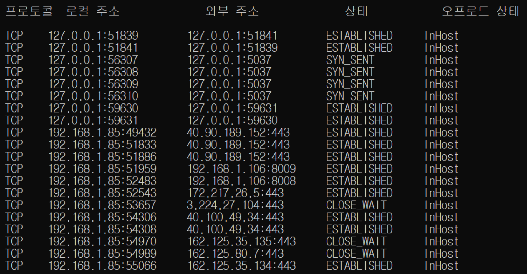 네트워크 계층의 식별자가 우리가 흔히 볼 수 있는 IP Address이다. 일반적으로 공유기가 IP 주소를 할당해주며 컴퓨터에서 IP 주소를 확인하려면 ipconfig 명령어를 사용하면 된다. 또는 전송 계층(TCP)의 상태 정보를 확인하는 netstat -tn 명령어로도 현재 사용하고 있는 IP 주소를 확인할 수 있다.
