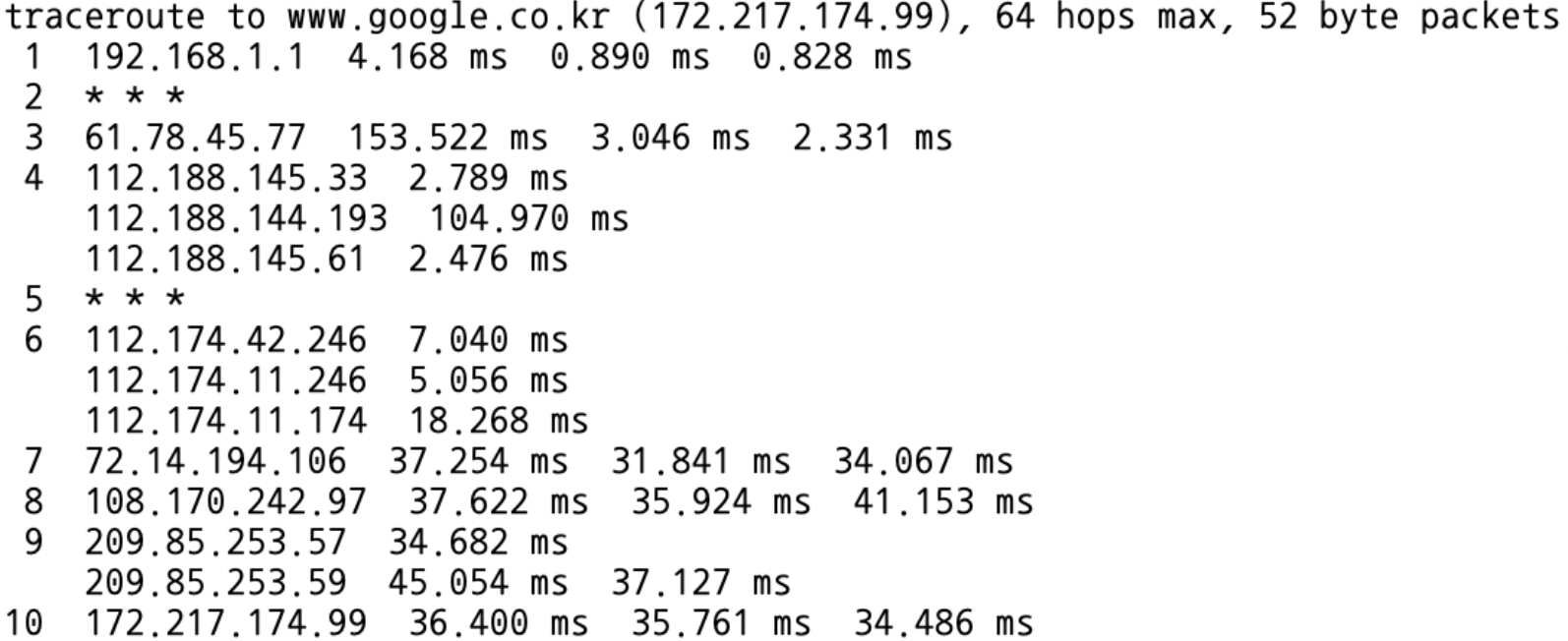 'www.google.co.kr'에 대해 데이터 패킷이 어떤 경로로 통과하는지 확인한 결과이다. 총 10개의 라우터를 거쳤으며, 각 라우터의 IP 주소 및 응답 시간을 볼 수 있다. 중간에 보이는 '* * *' 부분은 패킷이 차단된 경우이다. 보통 traceroute 결과에서 '* * *'로 표시되는 것은 패킷이 드롭되었거나, 방화벽 또는 보안 설정으로 인해 라우터를 통과하지 못한 경우, 응답 시간이 초과된 경우에 해당된다. 통신 회사 등 라우터 또는 네트워크 장치의 보안 설정에 의해 데이터 패킷이 차단되어 라우터를 통과하지 못할 수 있다.