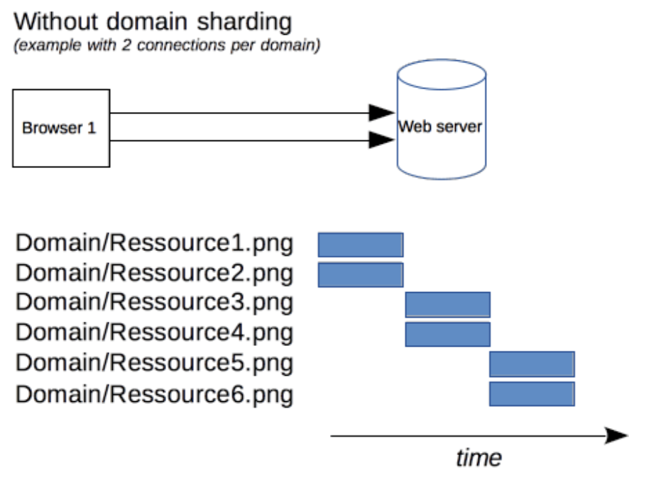하지만 도메인 샤딩을 사용한다면 같은 서버로 연결되는 도메인을 여러 개로 분할하여 리소스를 가져오기 때문에 하나의 도메인에서 요청을 모두 처리하는 case 1보다 더 빠르게 요청을 처리할 수 있게 된다. ( 순차 직렬 연결인 case 1 -> 동시 병렬 요청인 case 2)
