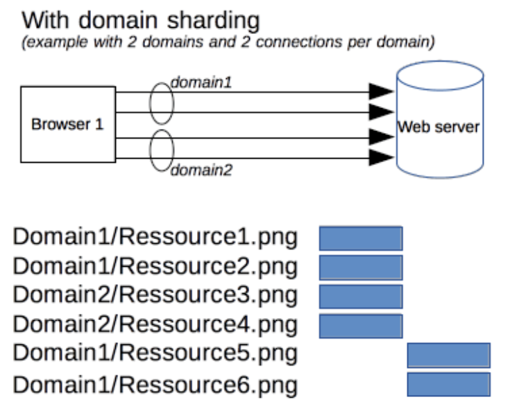 HTTP/1.1에서는 도메인 샤딩(domain sharding)을 이용한다. 도메인 샤딩이란 여러 개의 TCP 연결 제한을 피하기 위해 도메인 서버를 여러 개 두는 방법이다.